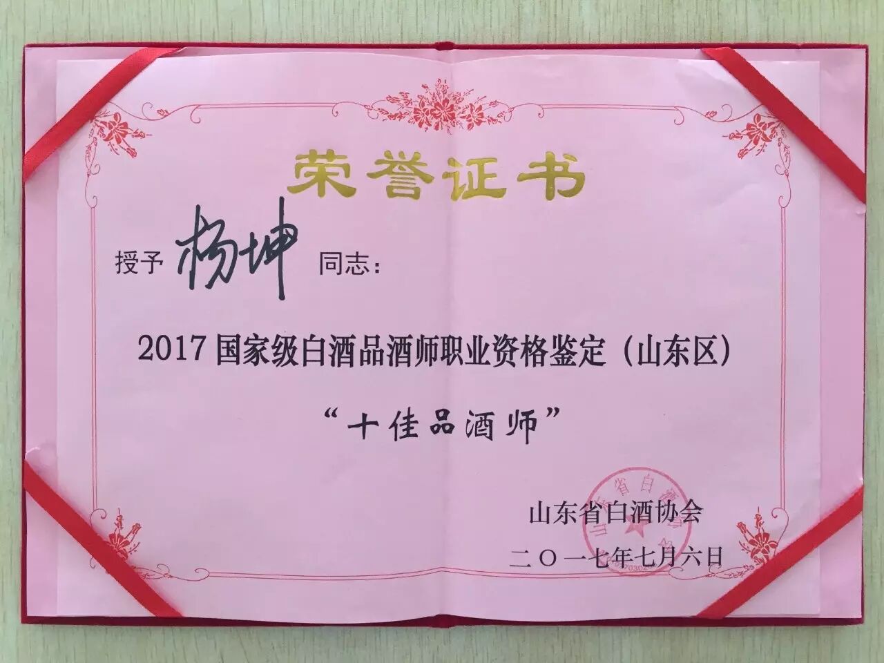 2017年7月2日至6日,在济南举行的山东省白酒品酒师国家职业资格鉴定会上,天地缘酒业有限公司品酒室科员杨坤同志凭借扎实的理论基础和精湛的品评技能,以优异的成绩获得了2017国家级白酒品酒师职业资格鉴定(山东赛区)“十佳品酒师”荣誉称号。