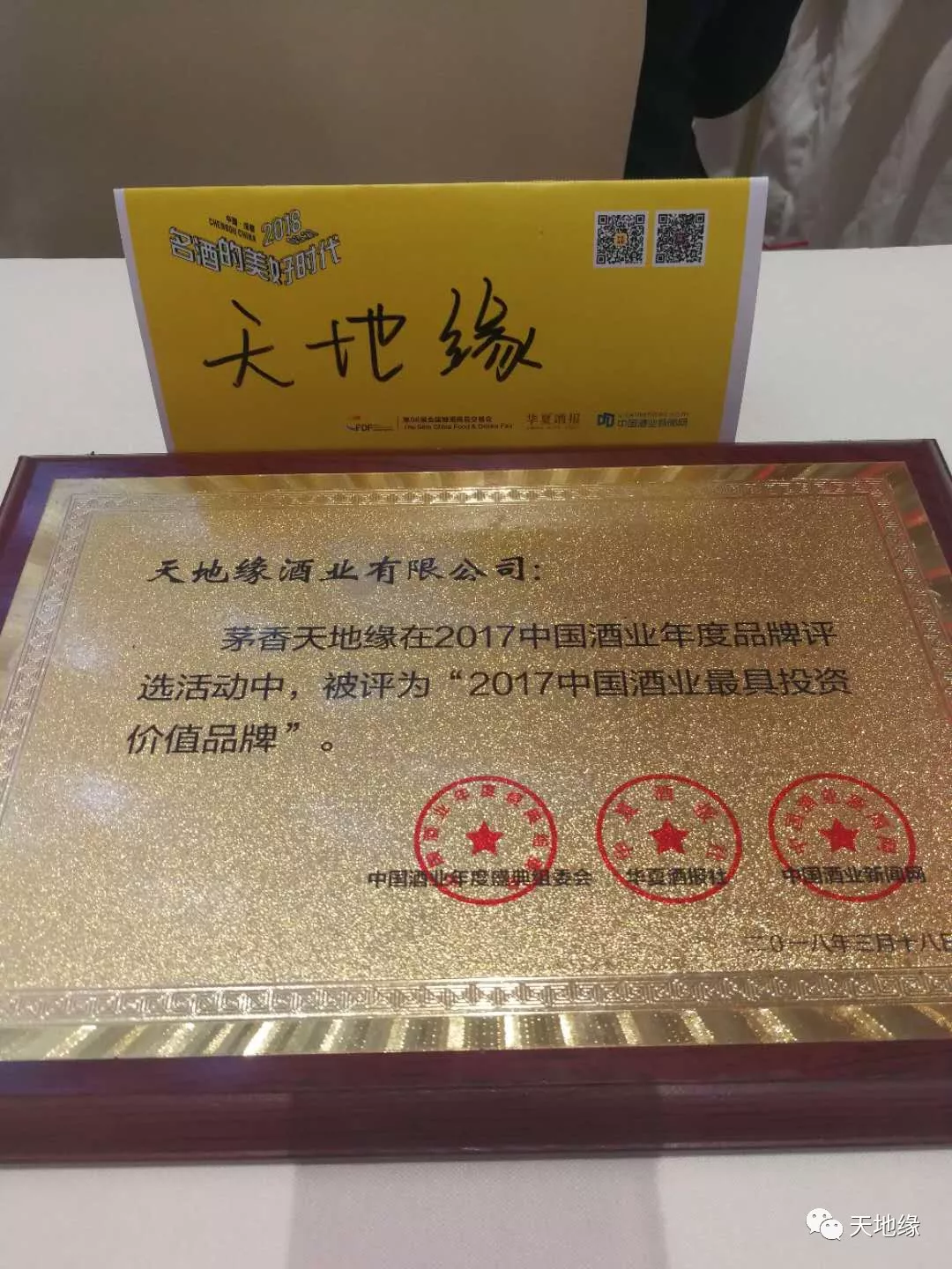 3月21日,由全国糖酒商品交易会办公室支持,华夏酒报和中国酒业新闻网主办的“名酒的美好时代”——2018中国酒业高峰论坛暨华夏酒报·国家品牌食品周刊创刊仪式”在成都西部国际博览城国际展览展示中心举行,同期举办了2017中国酒业年度盛典颁奖典礼。茅香天地缘被评为2017中国酒业最具投资价值品牌。